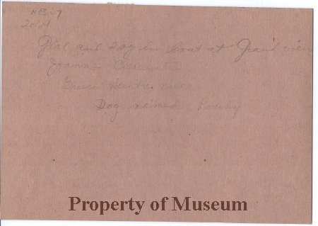 Joanne Clearwater (Bruce Hunt's niece) and large long—haired dog, Rowdy, sit on a wooden boat in front of Grandview Resort sign. a cabin is seen in the background and dock structure in the foreground. This is part of a set of Grandview Lodge photos.