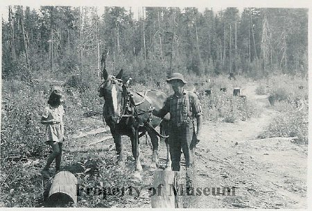 Excerpt from Donor's letter says: "Mr. Handy had a work horse named Minnie; she was very gentle. He hitched her up to his wood wagon and followed a road through the woods to an area where he felled trees, cut and split them into logs at his primitive "saw mill." At times, he would take some of us kids on the wagon. We would help him load and cut wood and bring it back to the cabins and stack it on the back porches. I remember my dad further splitting the logs for kindling."
