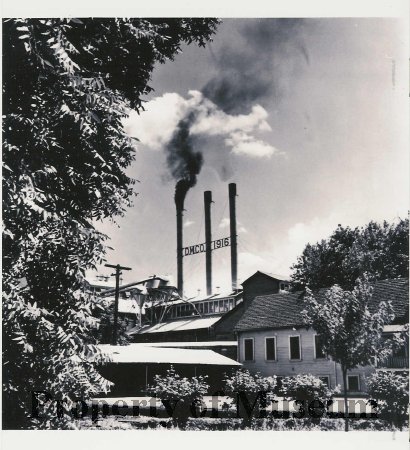 Diamond Match Saw mill. Stretched between the smokestacks says: D.M.C.O. 1916. One smokestack is active.