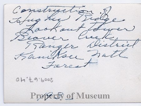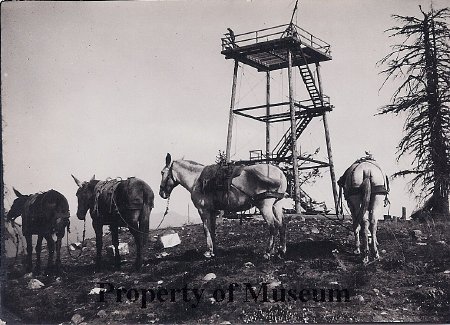 Image of a packtrain in front of a half finished lookout tower.  There is no building on top of the tower yet.  Written on the back of one of the images is:  "Construction of Hughes Ridge Lookout Tower.  Beaver Creek Ranger District.  Kaniksu Natl Forest.  193_""