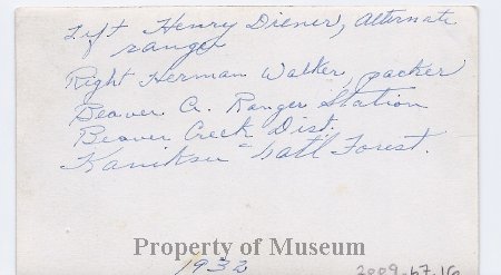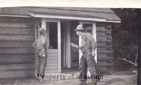 Image of two men standing in front of a  Beaver Creek RS building door.  One man is pretending to hold up the other man with a gun.    Written on the back of the image is:  "Left, Henry Diener, alternate ranger / Right, Herman Walker, packer.  / Beaver Creek Ranger Station / Beaver Creek Dist. / Kaniksu Nat'l Forest / 1932"
