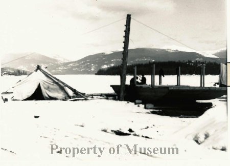 Barge in Kalispell Bay in front of CCC Camp F—142 in Winter — 1936