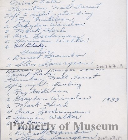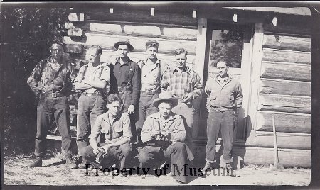 Image of 8 men standing for a group photo in front of a log building at Beaver Creek Ranger Station.  .    Written on the back of the image is:  "Beaver Cr. Ranger Station / Priest Lake / Kaniksu National Forest / Left to Right standing 1. Roy Mikelson, 2. Graydon Winslow, 3. Mark Herd, 4. Ora Ludemann, 5. Herman Walker, 6. Bill Blake.  Kneeling 1. Ernest Grambo, 2. Stanley Spurgeon." and written on the back of the other image is:  "Beaver Cr. Ranger Station / Priest Lake / Kaniksu National Forest / Left to Right standing 1. Roy Mikelson, 2. Graydon Winslow, 3. Mark Herd, 4. Ora Ludemann, 5. Herman Walker, 6. Bill Evans.  Kneeling 1. Ernest Grambo, 2. Stanley Spurgeon / 1933"