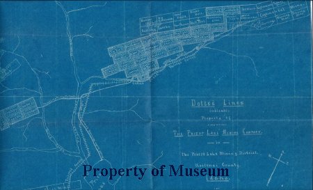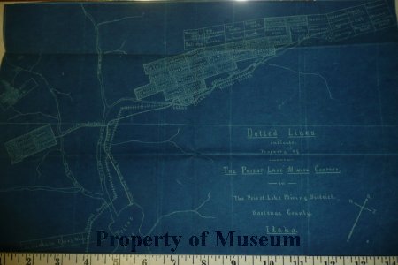 Object is a blueprint map of the Priest Lake Mining Company properties that accompanied the William Burk letters to John Hearding. In 1904 this land was part of Kootenai County.
