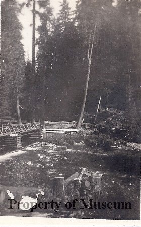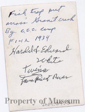 Image of a log contraption (a fish trap) going across a creek (Granite Creek).  Written on the back of the image is:  "Fish Trap put across Granite Creek by CCC Camp F—142 1934 — Harold and Edward White Twins from Priest River"