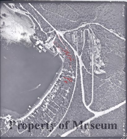 Aerial of Kalispell Bay in 1973 showing CCC camp, Marina and cabins.  On upper edges 7—11—64 and KA 8—73.  Nothing on back.
