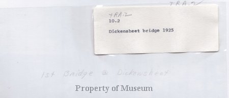 The photo is part of the University of Idaho Library collection per the label on the back of the photograph. Written on the back of a black and white copy of the photograph is: "1st Bridge @ Dickensheet".