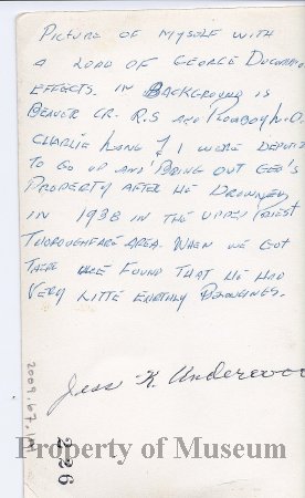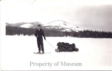 Image of a Jess Underwood on snowshoes on a snow covered and frozen lake dragging a sled full of George Ducommon's possessions. In the background, Beaver Creek Ranger Station is visible. Written on the back of the image is: "A picture of myself with a load of George Ducommon's effects. In background is Beaver Cr. RS and Plow Boy LO. Charlie Long and I were deputized to go up and bring out Geo's property after he drowned in 1938 in the Upper Priest Thoroughfare area. When we do there we found that he had very little earthly belongings. Jess K Underwood."