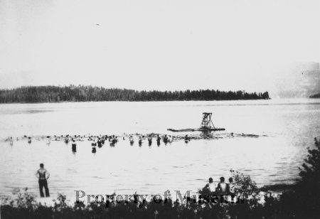 CCC Swimming Lessons at Kalispell Bay, Camp F—142. Boys brought from other camps. Row of boys in lake with guard and stand. 1935. Peterson, Chuck