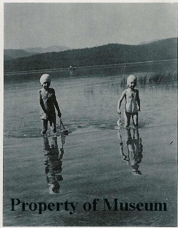 Image of two children in swimsuits and swim caps wading in the water. They are both trailing toy sailboats. The Lake is in the distance. Written on the back of the image is: "Wading in the water — Handy's Resort (Ann Cassill right) August 1942"