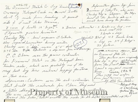 Note from donor on the back of the image is:  "Information given by Jim Norman of Valley, WA, who was Charley Rhy's stepson.  The Rhy's lived at the landing site in a small house during the operation.  The Diamond Match Co. Log Train (Lakeshore Limited) crossing Kalispell Creek on curved trestle about 3/8 mile from landing at present site of the Priest Lake Marina.  8 cars of double 16' logs load, 2 trains alternated. 2 loads one day, one load the next day, 3 loads a day _____ total of 48 truckloads a day or 24 of today's 32 footers.  Approximately 1929.  Plymouth gasoline locomotive.  Charley Rhy — head engineer at controls, also repaired locomotives during winter.  Charley was a "big" man 6'5" about 275 lbs.  Wife Gertrude, 2 stepsons Jim and Benny.  E. C. Olson was the prime contractor for Diamond Match on the Kalispell basin timber sale, which was probably one of the very last big time railroad logging operations in this area.  Symmes—Carlson was the sub—contractor that built the railroads for Olson.  They used a little shay steam geared locomotive for construction.  The area was logged from the extreme end of the rails toward the lake, which enabled the rails to be lifted and installed up the various spurs, each as Diamond flats etc…  This picture was originally taken by a pro photographer from the Priest River Times, copied and recopied many times.  Circa 1929.  This copy and information from Jim Norman made by Pete VanGelder Kalispell Bay N. 6207 Lincoln / Spokane, WA 99205.