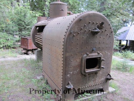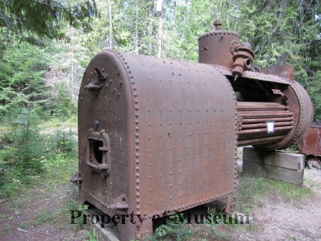 Steam boiler from the Woodrat Mine. Sides are riveted with conical shaped rivets. The Fire Box (60 inches in length) has a square raising door (which is missing) and is connected to the Heat Exchanges (70 inches in length). The Heat Exchange is missing its cover, and the series of horizontal pipes reaching from the Fire Box to the Cleanout Cap is now visible. The end has a cap with a raising lid for cleaning and a Oval chimney out the top. There is also a conical chimney (diameter 24" by 30" long) which raises above the Heat Exchange area and a Steam Outflow line comes out from the chimney.