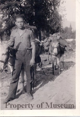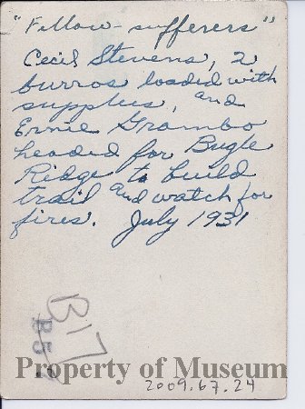 Image of a man (Cecil Stevens) with two burros loaded with supplies.  Written on the back of one of the images is:  "Fellow—sufferers.  Cecil Stevens, 2 Burros loaded with supplies, and Ernie Grambo headed for Bugle Ridge to build trail and watch for fires.  July 1931"