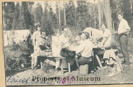 Image of 10 people seated and standing next to a picnic table eating. There are canvas tents and trees in the distance. Written on the bottom of the image is: "Priest Lake '16?"
