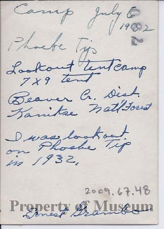 Image of a campsite. There is a crosscut saw leaning upright against a boulder. Written on the back of the image is: "Camp, July 6, 1932. Phoebe Tip. Lookout tent camp — 7x9 tent. Beaver Cr. Dist., Kaniksu Natl Forest. I was lookout on Phoebe Tip in 1932. Ernest Grambo."