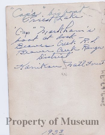 Image of the Seneaquateen Boat at dock at the Beaver Creek Ranger Station. There is a man standing on the dock and some people on the boat. Written on the back of the image is: "Cap's big boat. Priest Lake. Cap Markham's boat at dock. Beaver Creek RS. Beaver Creek Ranger District. Kaniksu National Forest. 1933"