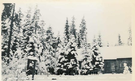 Image of building (Luby Bay Resort) covered in snow with sign to one side, surrounded by trees. Written on the bottom of the image: "54—103 — Xmas Day 1944 — Winter Scene — Luby Bay Resort — Priest Lake, Idaho"