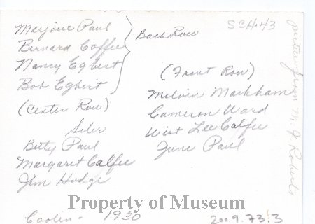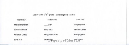 Student's names are written on the back of the black and white photograph. "Coolin — 1930", and "picture from M.J. Roberts" is also written on the back of the photograph.