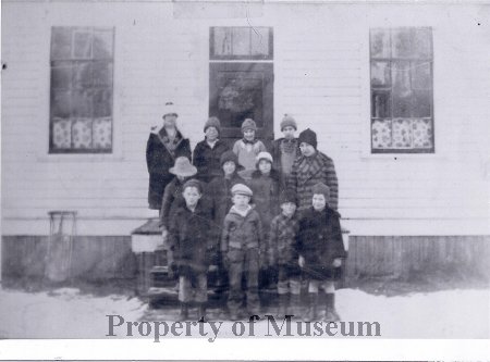 Teacher Bertha Egbert and eleven students (or twelve students and teacher is not pictured?) stand on the steps of the school in snowy weather.