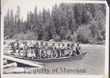 Diamond Match log drive down the Priest River  from an album of Jack Barren's. Shows crew lined up in the bateau.   In a Oct. 2004  Timber article it identifies the photograph from the 1947 drive at Eight Mile rapids.  Standing l to r, Bill Whetsler, Leo Black, Jim Bews, larry Gardiner, Bill dodge, Dave Bryant, Herman Red Rouse, Jack Webb, Pete Golden, Mile Rose, Paul LaMotte.  Seated Severt Flaten, Ernie Ward and Calvin Hoepfer.