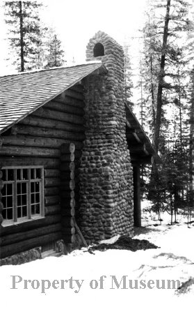 Black and white Image from disc, there is no photograph in the file. Caption reads: "Kalispell Bay CCC building. End view of cabin with rock chimney. circa 1935 Leo's Studio".