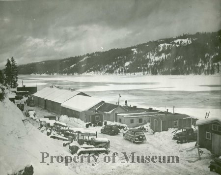 Diamond Match operations on Cavanaugh Bay January 10, 1949.  Images show the buildings looking north with Cats lined up covered in snow.  The lake is mostly frozen over.