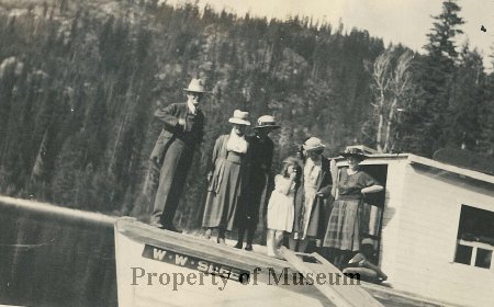 Group on bow of the W.W. Slee, probably at Mosquito Bay.