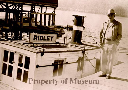 Image of a man in a hat standing on the dock next to a boat that has the sign: "Ridley" on top of it. There are more boats in the covered marina behind the boat. The opposite shore of Coolin Bay can be seen in the background. Written on the back of the image is: "Ridley with E.J. Elliot at the Marina (Coolin?) circa 1955"