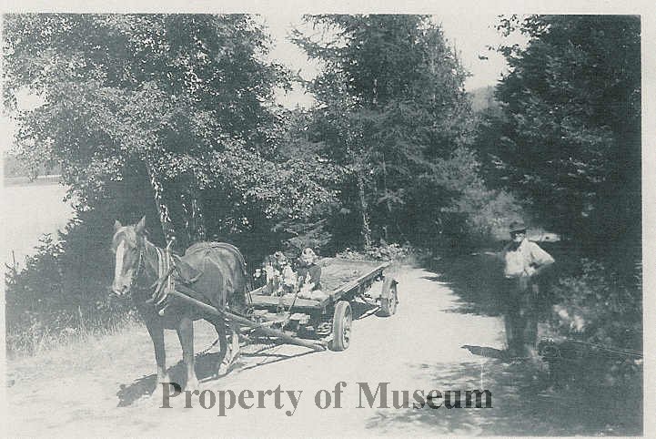 Henry Handy with Ann Cassill and Melinda Matthews in wood wagon - 1946