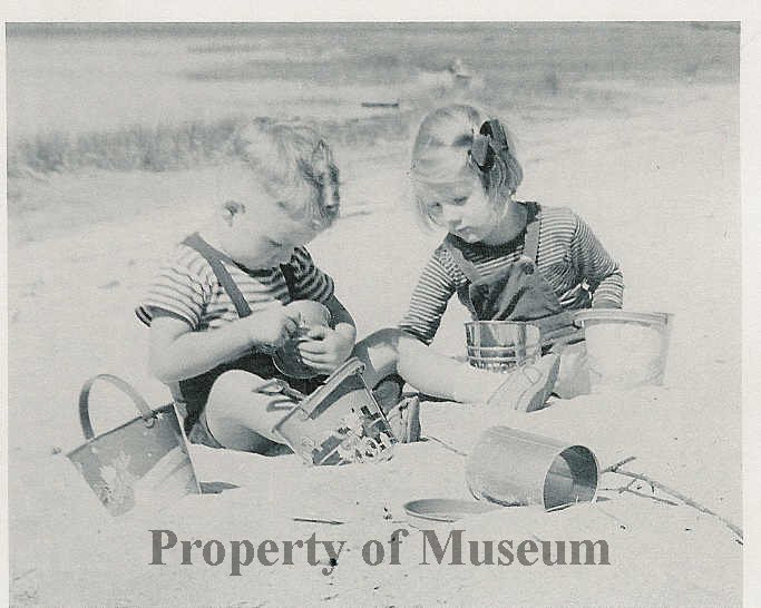 Image of a young girl and a young boy playing in the sand with buckets. The shoreline is in the distance. Written on the back of the image is: "Playing in the sand - Handy's Resort (Ann Cassill right) August 1942."