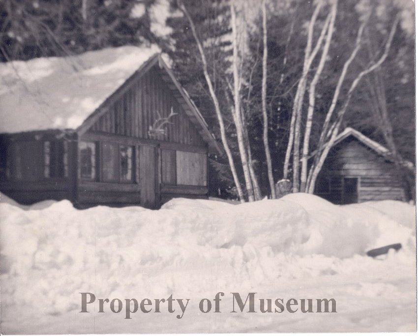 Image a cabin and an outbuilding in the snow. There are antlers above the door and trees in the background. Written on the back of the image is: "1st cabin at Lows Resort. Located at Kaniksu Resort now. Built 1938 or 1939. (Kaniksu initally belonged to Jim Low as well as Low's Resort)"