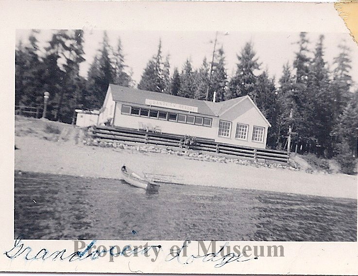 Image taken from the Grandview dock of the Grandview lodge and dancehall. There is a rowboat pulled up onto shore in front of the building. Written on the bottom margin is: "Grandview lodge" and written on the back of the image is: "Grandview dancehall"