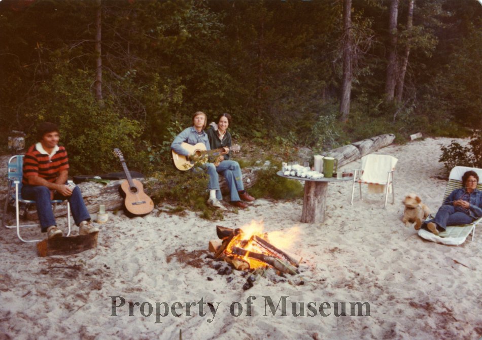 Image of five people around a campfire on the beach with two guitars.  The beach is in front of the Luby Bay cabin, and two of the people in the image may be the Frey's (the residents of the Luby Bay cabin in the late 1970's).