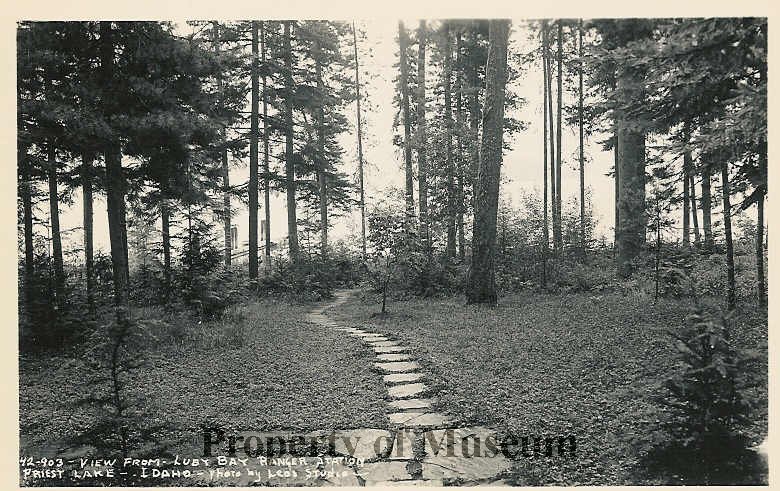 Image of the pathway leading from the Luby Bay Ranger Station Cabin to the Beach in Luby Bay. The path is paved with paving stones and the ground is covered with a low ground cover (moss?).  There are many fewer trees than there are today. Written on the bottom of the image in white ink is: "42-903 - View from Luby Bay Ranger Station - Priest Lake - Idaho - Photo by Leo's Studio" Written on the back in red ink is: "Front path in front of museum about 1938-1940"