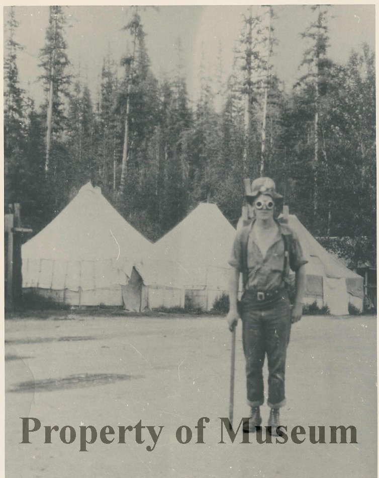 Image of a a man wearing goggles with a stick in one hand and a backpack on his back.  He is standing on a dirt ground and in front of three canvas tents.  There are trees in the background.