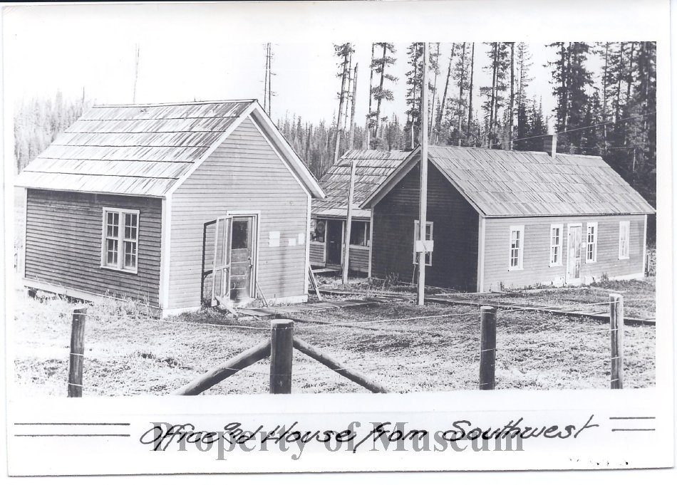 Image of a three buildings in a cluster.  Trees in the background and a fence in the foreground.  The screen door to the closest building is propped open.  On the lower margin of the image it is written "Office and House from Southwest"