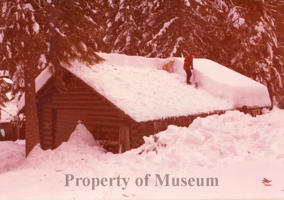 Shoveling snow off the roof of the Luby Bay Cabin - circa 1977-79