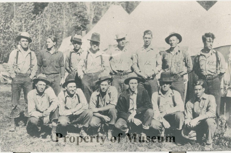 Image of a group of 14 men lined up for a group picture in two rows.  They are sitting and standing in a group in front of a group of white canvas tents.  Someone numbered the image, each of the men have a number written above their head, the numbers are faint but it looks like it goes up to 14.  Note in Photocopy book says:  "bismark hellcats fire Overhead Crew 1930.  Clarence Sutliff photo.  1.  Roy Baughman, 2. Fate Alford, 3. Merlie Morrow, 4.  Al Spaulding, 5.  George Moor, 6. Joe Wolfolk, 7. herb Carlin, 8. Lorne Simpson, 9.  Del McQuilkin, 10.  Tom Piper, 11. John Macarty, 13. Dick Whittaker, 14. Finn Frost"