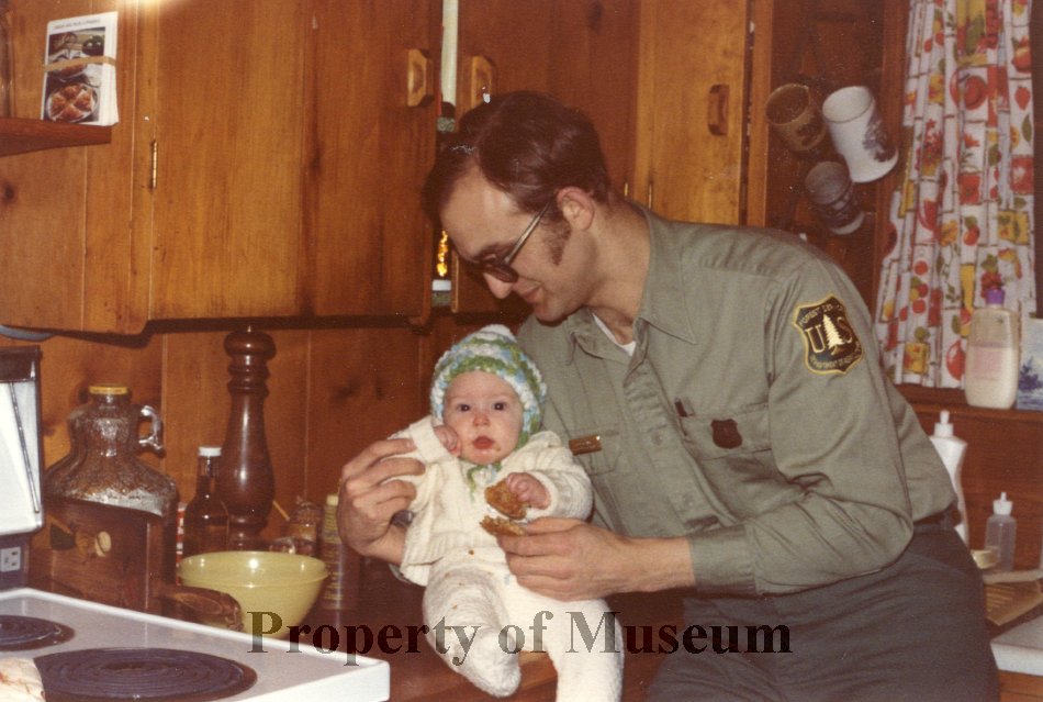 Image of George and Katie Frey in the kitchen of the Luby Bay Cabin. George is standing and holding Katie on the counter in between the stove and kitchen sink.