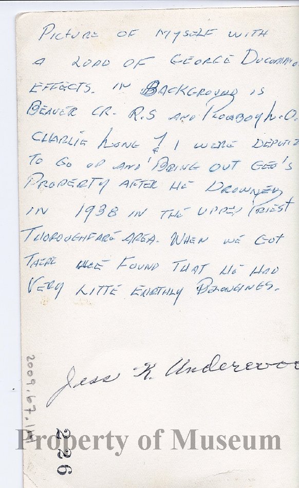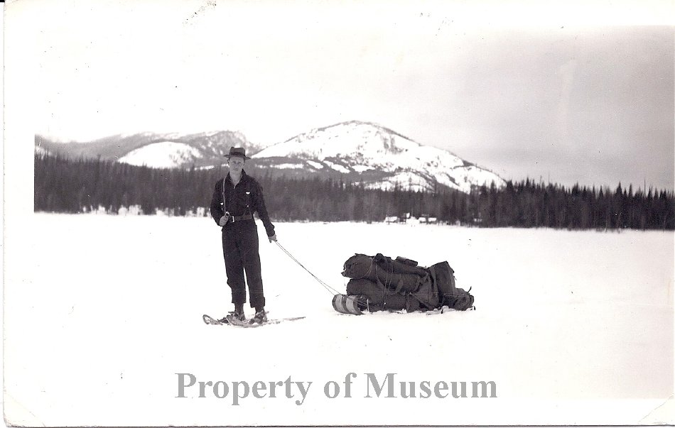 Image of a Jess Underwood on snowshoes on a snow covered and frozen lake dragging a sled full of George Ducommon's possessions.  In the background, Beaver Creek Ranger Station is visible.  Written on the back of the image is:  "A picture of myself with a load of George Ducommon's effects.  In background is Beaver Cr. RS and Plow Boy LO.  Charlie Long and I were deputized to go up and bring out Geo's property after he drowned in 1938 in the Upper Priest Thoroughfare area.  When we do there we found that he had very little earthly belongings.  Jess K Underwood."