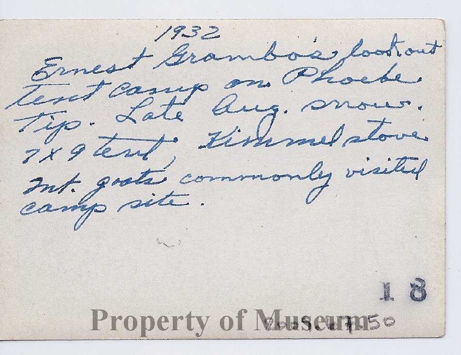 Image  of a campsite in the snow.  Written on the back of the image is:  "1932.  Ernest Grambo's 'Lookout' camp on Phoebe Tip.  Late August Snow.  7x9 tent, Kimmel stove.  Mt. Goats commonly visited campsite."