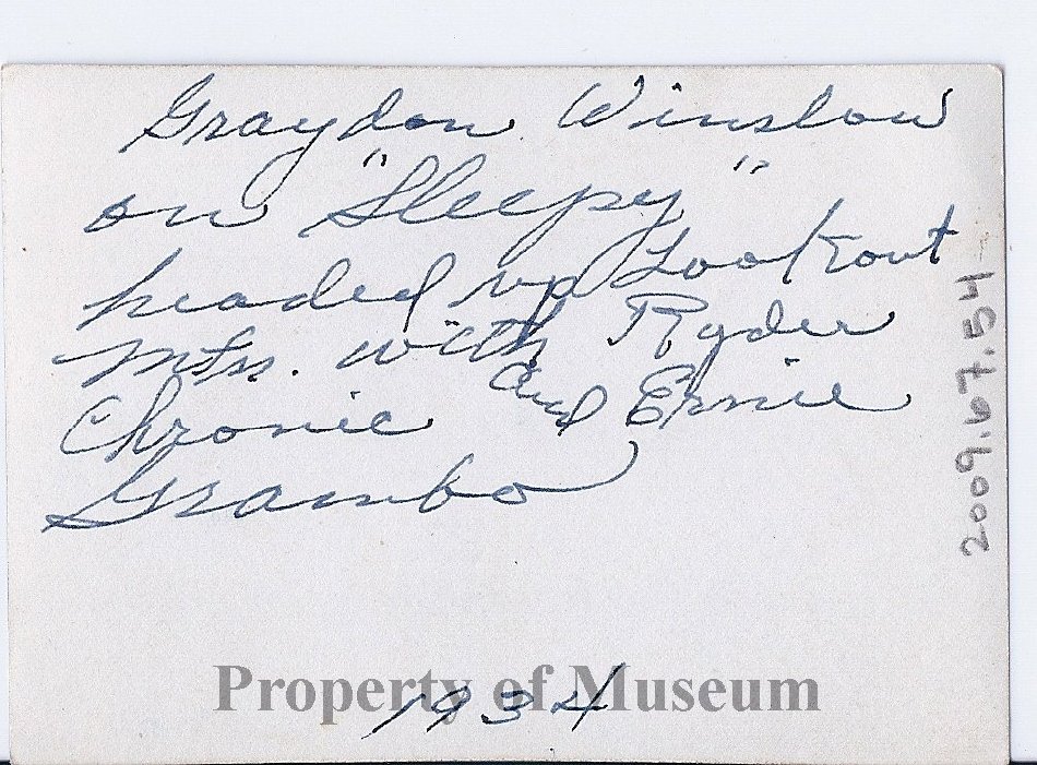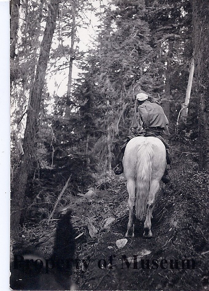 Image  of a man (Graydon Winslow) on horseback from behind ridding up a hillside.  Written on the back of the image is:  "Graydon Winslow and "Sleepy" headed up Lookout Mtn. with Ryder Chronic and Ernie Grambo.  1934