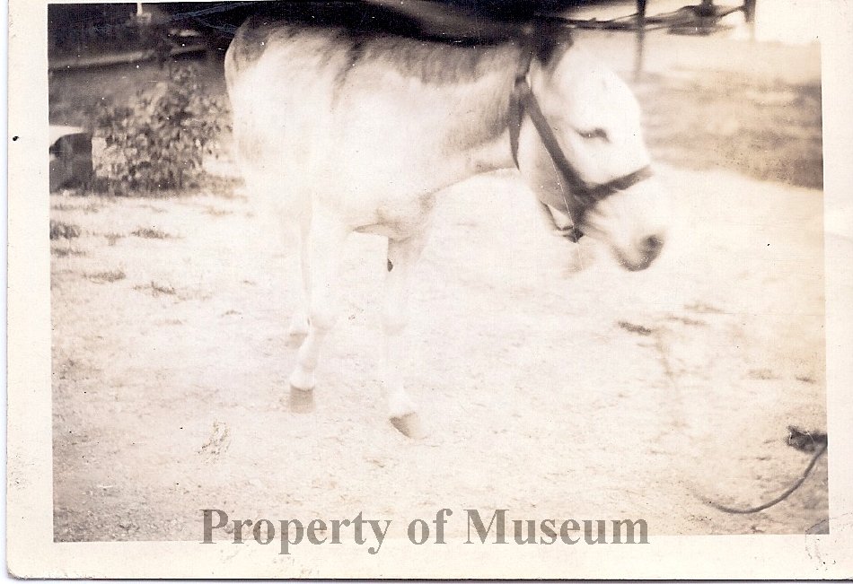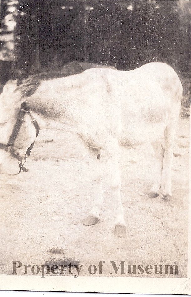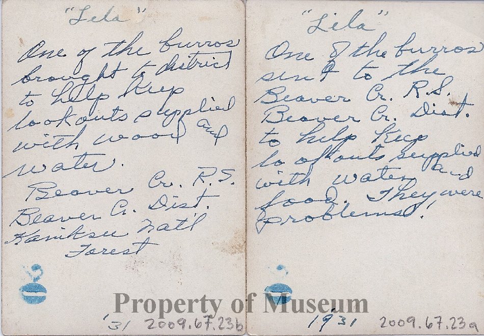 Two images of a light colored burro.  Written on the back of one of the images (23a) is:  "Lila, one of the burrows sent to the Beaver Cr. R.S., Beaver Cr. Dist. to help keep lookouts supplied with water and food.  They were problems! 1931" and written on the back of  the second image (23b) is:  "Lila, one of the Burros brought to district to help keep lookouts supplied with wood and water.  Beaver Cr. R.S., Beaver Cr. Dist., Kaniksu Nat'l Forest.  '31"