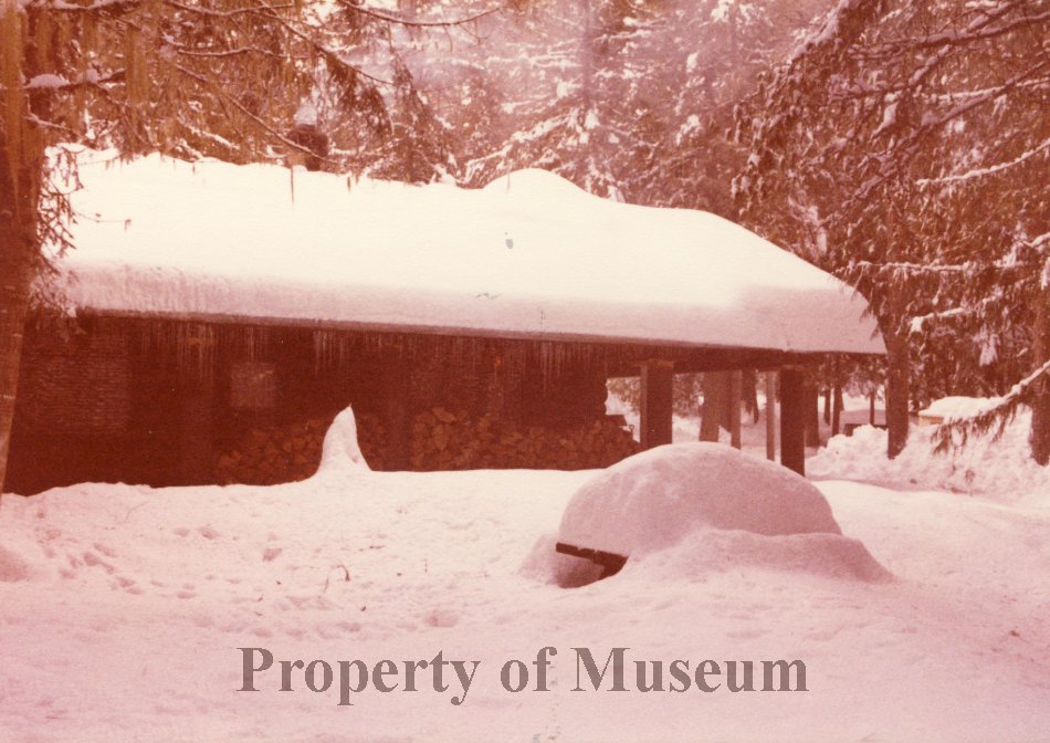Image of the front porch of the Luby Bay Cabin in the snow.  There is a picnic table in front of the cabin covered in snow, and cut firewood lining the front porch.