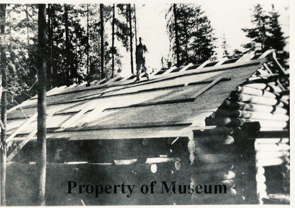 Image of a man standing on the roof of what looks to be the Luby Bay Cabin.  The roof is unfinished, the chimneys are not yet built.  The image was taken looking northeast.