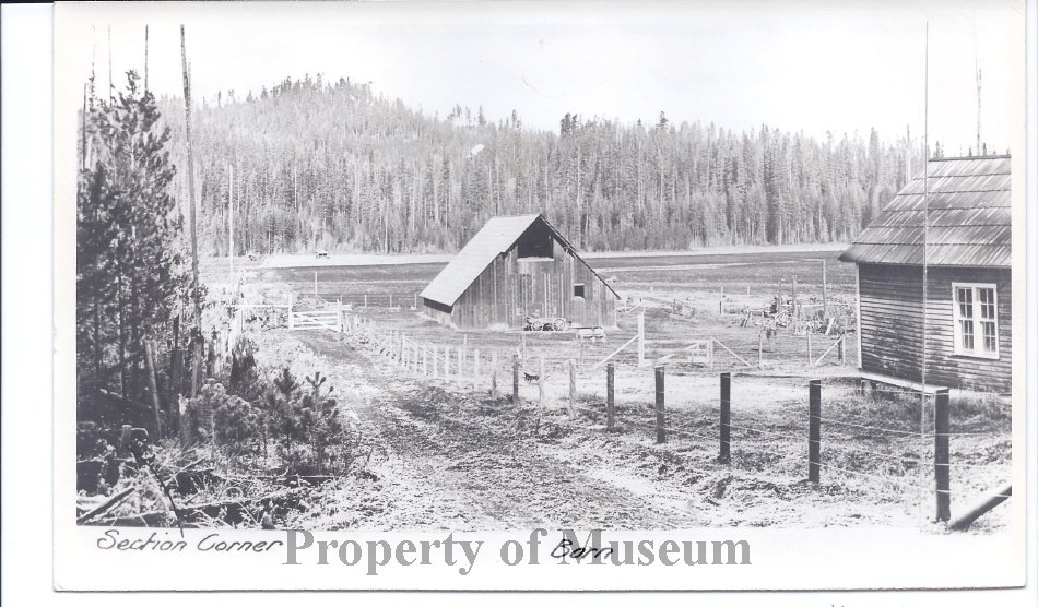 Image of two buildings, one is a barn.  There is a hill in the background .  The image is labeled on the bottom  "Section corner   Barn"  This image shows the entire Gleason yard when paired with 2009.42.16 and makes a panorama.