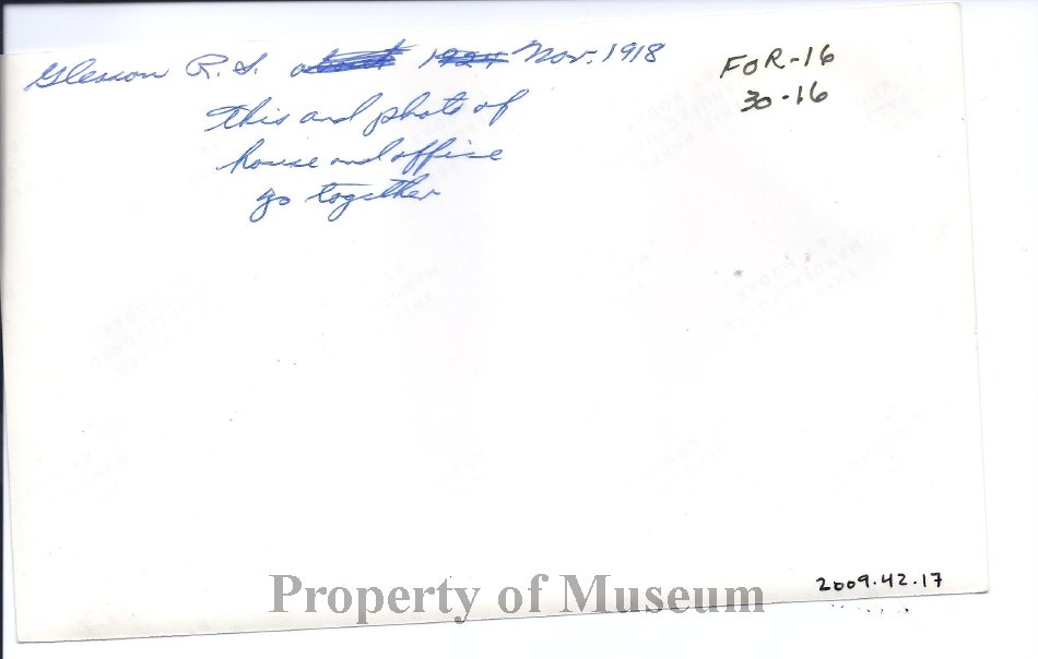The back of the photograph says: "Gleason R.S. Nov. 1918. This and photo of house and office go together."
