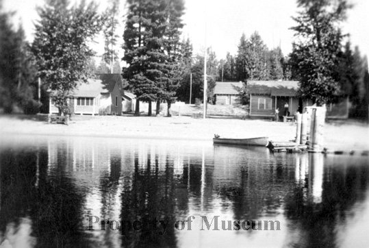 Image of the Beaver Creek Ranger Station from the water looking towards the shore.  there is a small boat with a motor tied to the dock.  Three men are on the porch of one of the buildings.      Written on the back of the image is:  "Beaver Creek Ranger Station 1930-1934"