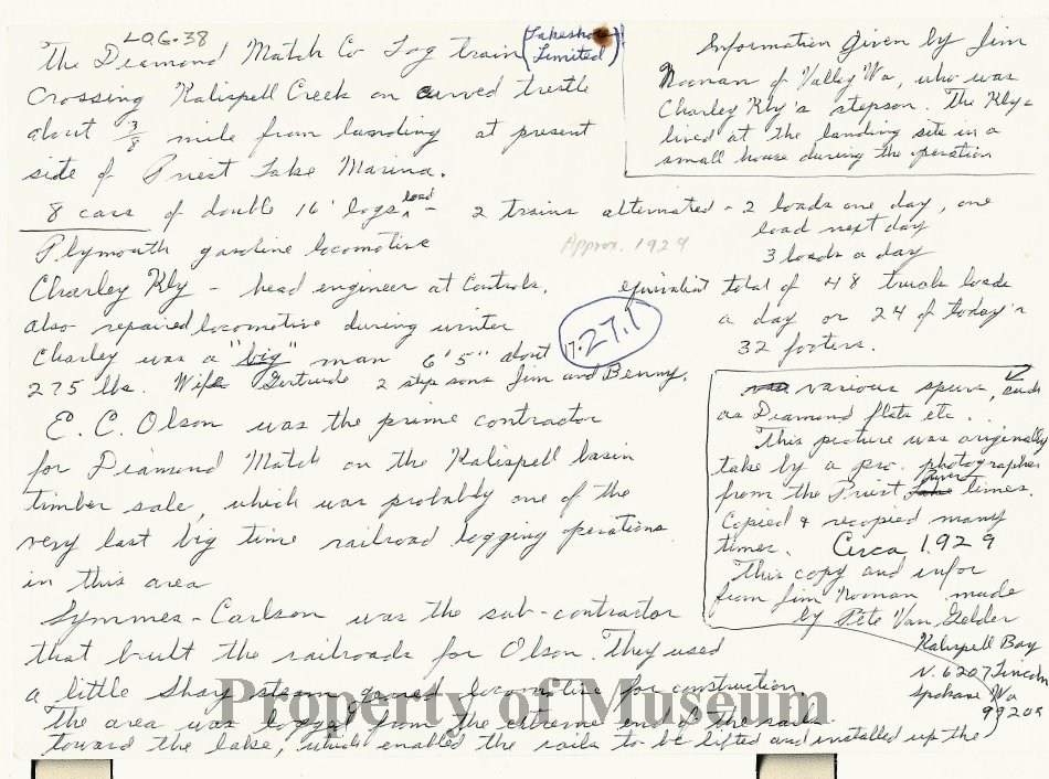 Note from donor on the back of the image is: "Information given by Jim Norman of Valley, WA, who was Charley Rhy's stepson. The Rhy's lived at the landing site in a small house during the operation. The Diamond Match Co. Log Train (Lakeshore Limited) crossing Kalispell Creek on curved trestle about 3/8 mile from landing at present site of the Priest Lake Marina. 8 cars of double 16' logs load, 2 trains alternated. 2 loads one day, one load the next day, 3 loads a day _____ total of 48 truckloads a day or 24 of today's 32 footers. Approximately 1929. Plymouth gasoline locomotive. Charley Rhy - head engineer at controls, also repaired locomotives during winter. Charley was a "big" man 6'5" about 275 lbs. Wife Gertrude, 2 stepsons Jim and Benny. E. C. Olson was the prime contractor for Diamond Match on the Kalispell basin timber sale, which was probably one of the very last big time railroad logging operations in this area. Symmes-Carlson was the sub-contractor that built the railroads for Olson. They used a little shay steam geared locomotive for construction. The area was logged from the extreme end of the rails toward the lake, which enabled the rails to be lifted and installed up the various spurs, each as Diamond flats etc… This picture was originally taken by a pro photographer from the Priest River Times, copied and recopied many times. Circa 1929. This copy and information from Jim Norman made by Pete VanGelder Kalispell Bay N. 6207 Lincoln / Spokane, WA 99205.