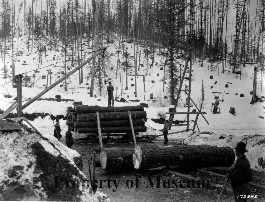 Beardmore Sale 1923, Man Standing on Log Deck, Loading Logs onto Sleighs